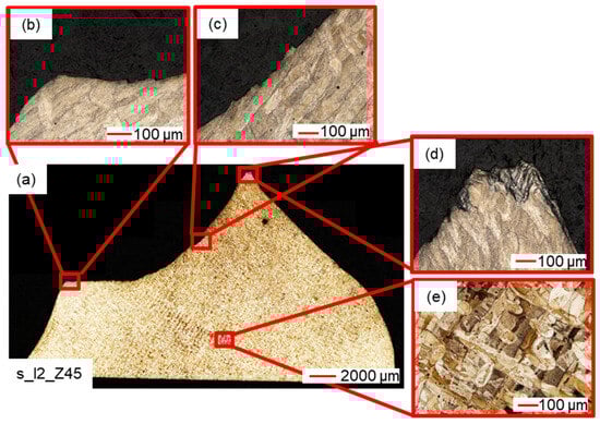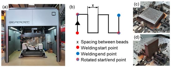 The WA-DED process was realized on a GEFERTEC M50 5-axis machine (see Figure 7). The welding power source was a Fronius TPSi500. For each two building orientations flat and upright, one solid block of dimensions 150 × 30 × 150 mm³ (length, width, height for flat orientation) was welded. This simplified geometry was chosen to better neglect geometry specific thermal influences regarding microstructure development. The substrate material was stainless steel 304 (1.4301) with a dimension of 200 × 200 × 10 mm³ (width × length × height) for the flat orientation (Figure 7c) and 60 × 200 × 10 mm³ for the upright orientation (Figure 7d), respectively. The WA-DED process parameters are shown in Table 5. A meander strategy (zig zag pattern) was used to have less welding start and end points and therefore a more stable WA-DED process with lower cooling rates of the weld beads. The start and end points rotated over the corners after finishing a layer to achieve a well distributed material deposition and to reduce material deficits or accumulation. Shielding gas ArC2 (98% argon, 2% carbon dioxide) with a gas flow rate of 15 L/min was used to protect the weld beads from oxidation. A machine-integrated pyrometer (emission coefficient set to ε = 1.0) measured the interlayer temperature to ensure that the interlayer temperature before the welding start was below 150 °C.