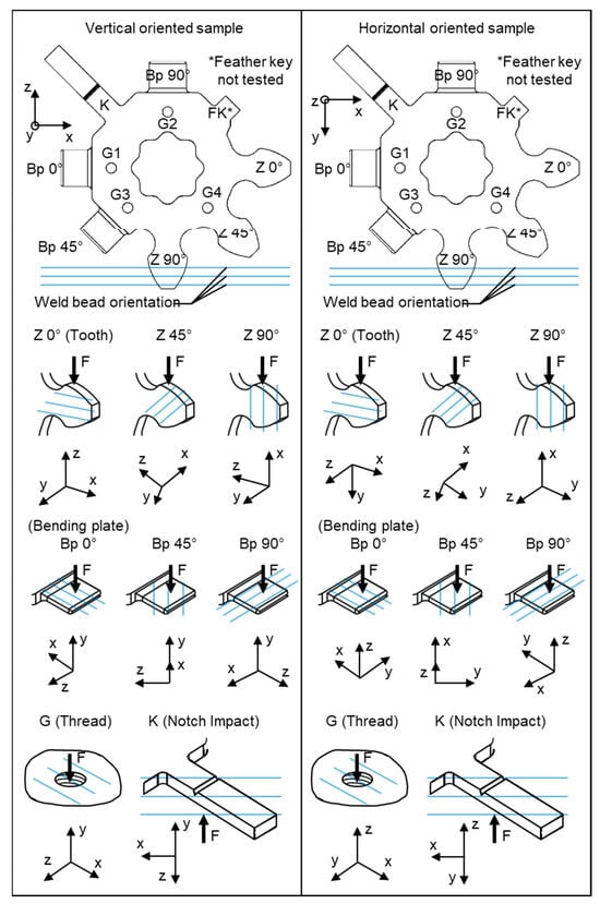The aim is to consider as many of the essential influencing parameters of the respective manufacturing process as possible and then to describe these with a manufacturing factor depending on the machine element. In this work, two additive manufacturing routes, the fast and cost-effective arc build-up welding (WA-DED) and the laser powder bed fusion (L-PBF), are compared with pure milling from sheet metal. The test specimen acts as both a demonstrator geometry and a test geometry. The first parameters considered are the manufacturing welding option with rework and the weld orientation, whereby the weld orientation has a significant influence on the mechanical properties (for more information, see Section 2.5 and Section 2.7). The weld sequence and base plate position are described in Section 2.5 and influence the microstructure. The test component is visualised in Figure 2; the essential tests for the individual features are given with the corresponding standards. On the outside, eight placeholders for machine elements were arranged on a diameter of 80 mm. The interior space was used with smaller specimens or for fixing the component in the testing machine.