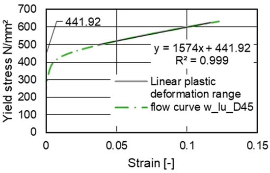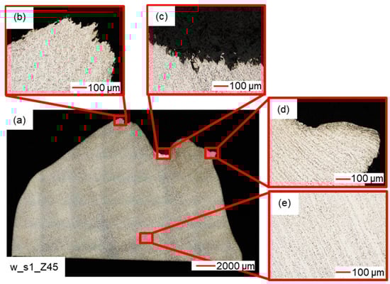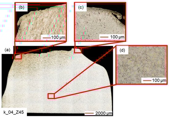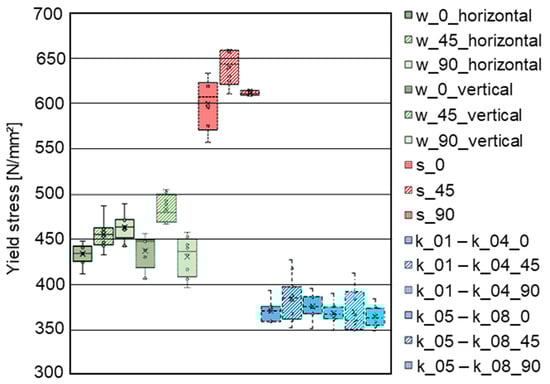 The impact of the component geometry on mechanical properties is a well-known phenomenon that is duly considered in component design through the incorporation of notch and shape factors. The aforementioned factors enable the capture of distinct stress distributions, local plastic strains, notch effects, and inhomogeneous microstructure development, thereby obviating the need for component-specific tests during the design phase []. However, incorporation of the manufacturing process as a design factor is currently not feasible even for materials that are extensively utilized. So far, only surface treatments (e.g., shot peening) and/or heat treatments (e.g., induction heating) that can improve mechanical properties have been used as multiplicative factors in a range of 0.8–1.4 for the calculation []. These factors are only applicable to the calculation of fatigue strength.