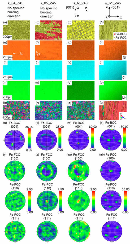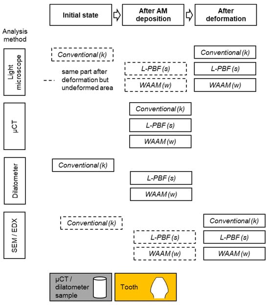 The metastable austenitic steel 316L is a widespread AM material and was used in this work. It has a high ultimate tensile strength, beneficial forming properties, and is corrosion resistant. It can be well-processed by a wide range of manufacturing processes, providing good flexibility for a wide range of products. The chemical composition of the powder for L-PBF comes from SLM Solutions Group AG, Lübeck, Germany, for the wire from MIGAL.CO GmbH, Landau an der Isar, Germany and for the sheet from Stahlhandel Gröditz GmbH, Gröditz, Germany (Table 1).