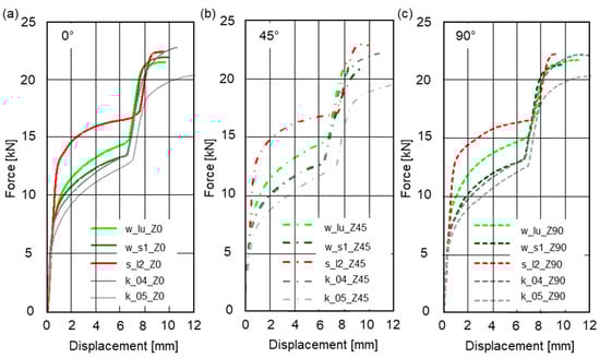 Force displacement curve of (1) first, (2) second, and (3) third pre-loads of k_04 tooth tests (a); bending plates (b); thread tests (c); in 90° weld orientation.