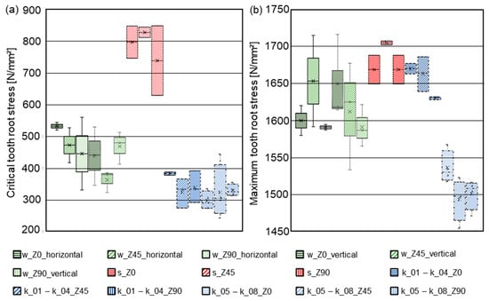 The following are some notes on application-related tests that allow conclusions to be drawn about the quality of the additive manufacturing process. Ayan et al. used tensile test geometries to examine the bending fatigue properties of structural steel produced by WA-DED []. Concli et al. investigated the bending fatigue behaviour of 17-4PH gears produced by AM. They used a single-tooth bending fatigue approach to determine the bending strength. They found good bending strength without any further treatment but highlighted the importance of defects, which negatively affect the gear []. Schmitt et al. also applied dynamic mechanical testing to a gear made of 16MnCr5 processed by L-PBF to determine the tooth root bending strength. They showed that the achievable tooth root strength lies closely under the value of a conventional gear made of case-hardened steel. Additionally, this also showed the influence of the sample orientation, manufacturing process, and post-treatment on the tensile strength, which showed larger deviations [].