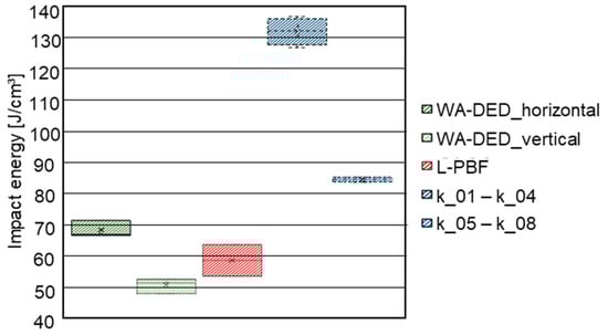The method of notched bar impact testing, as outlined in the DIN EN ISO 148 series of standards and commonly employed in both scientific and practical contexts, serves to determine the energy of notched bars under impact loads and consequently their corresponding behaviour []. The authors, Š. Hermanová et al., carried out a study on components manufactured through powder bed-based additive methods using 316L material. The study aimed to determine the maximum notched impact energy of these components []. Deng et al. (2019) performed a similar study and made a distinction between specimens that underwent heat treatment at 650 °C and those that did not []. In their study [], Davies et al. conducted comparable investigations wherein they analysed samples taken both horizontally and vertically in their original state, as well as after undergoing heat treatments at 700 °C and 900 °C. Komorasamy et al. accomplished a comparative analysis of the behaviour of notched bar impact specimens extracted horizontally and vertically with respect to the direction of exposure as per DIN EN ISO 148 on Inconel 718 []. Yasa et al. examined the notched bar impact strength of L-PBF produced parts made of 316L, Ti6Al4V, and maraging steel. Here, they used a cuboid testing geometry with and without notches. The varied process parameters were the building orientation (x, y, z) and heat treatment. They found that the preparation (conventionally or by electrical discharge machining, EDM) of the notch and the building orientation showed no significant influence on the toughness []. Afkhami et al. investigated the influence of the weld orientation vertically and horizontally to the notch and found that there is no correlation [].