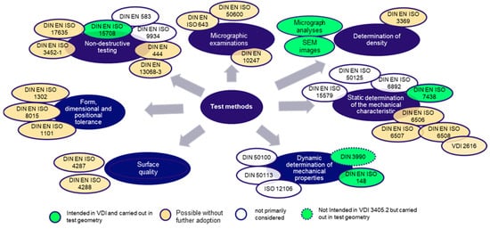 AM processes need to be qualified to ensure the production of defect-free parts and the achievement of desired (minimal) mechanical properties like ultimate or yield strength. The easiest, and at the beginning of a qualification process the most informative testing method, are static tensile tests. The often-chosen geometries are therefore near net-shape geometries of tensile test samples or simple walls, where tensile test samples are extracted from. Further test geometries are specific, e.g., bending and shear or also crack propagation, which are also further separated in static and dynamic loads.
