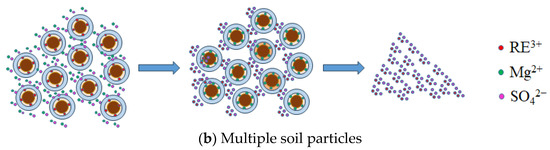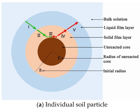 The ion leaching of rare earth elements is a heterogeneous reaction between a liquid containing leached cations and the solid rare earth mineral deposits [24]. Its essence is the exchange reaction between injected cations and rare earth ions adsorbed by clay mineral particles [25]. The leaching process is a typical L–S (liquid-solid) heterogeneous reaction [26]. If the granular mineral soil is assumed to be spherical, its leaching process can be described with the “shrinking core model” [27,28,29,30].
