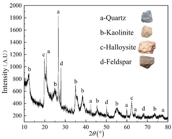 For an accurate representation of the deposit sample’s physical properties, we used a Luoyang shovel and spade with a diameter of 160 mm in the sampling process. Firstly, the humic layer on the surface was removed. Then, we shoveled with a spade to the depth of 0.5 m, dug 1 m at a time. With a ring knife, we took three fully weathered soil samples at the distances of 3 m, 4 m and 5 m respectively. Thus, the samples added up to 9. As too much evaporation will effect the determination accuracy of the physical properties of the sample, we packed the RE deposit samples with plastic wrap to reduce the evaporation in the subsequent transportation process. Then, we brought back the remaining loose soil at the same depth with woven bags and marked the outside of the bags. Figure 2 shows the sampling site. The samples were tested and analyzed with ICP-MS Agilent 8800. Table 2 shows the testing results. According to the test results, the grade of rare earth reaches 0.086% (g/kg), with an equivalent molar mass of 127.62 g/mol. XRD (Empyream PANalytical) analysis demonstrates that the samples are mainly composed of quartz, kaolinite, halloysite and feldspar. Figure 3 shows the major mineral components of the sample.