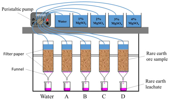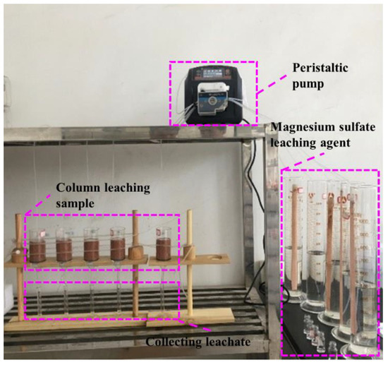 A self-made PMMA tube with a diameter of Φ11 cm and a length of 28 cm was used for the expansion test of the column leaching process. In accordance with the porosity ratio, we filled the RE deposit sample in the leaching column by referring to the operation regulations [39]. For uniformity of the deposit sample in the column, the tamping depth of each layer was determined to be 5 cm, with a filling depth of 20 cm. Then, the samples were vertically fixed on an iron frame. The four leaching columns were dripped with MgSO4 with concentrations of 1%, 2%, 3% and 4%, respectively, as shown in Figure 5. Applying a peristaltic pump, we controlled the flow rate of the leaching solution so it was 1 mL/min. Mounted 5 cm upward from the top of the column, an overflow hole served to store the leaching agent. The pressure head was maintained at a certain level so that the leaching liquid could flow downwards at a constant speed, and the leaching column was always in a saturated state. During the experiment, the leach liquor collection and liquid injection were performed simultaneously. At the same time, the collected leach liquor was evenly mixed. A separate sampling and leach liquor collection sampling were carried out every 1.5 h. Then, their RE3+ concentrations were determined by EDTA titration. When the concentration of rare earth ions in the leaching solution sampled separately was less than 0.05 g/L, we ceased injecting the liquid. This experiment was also carried out at room temperature.