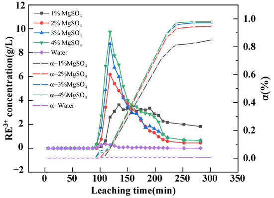 The experiments revealed that the peak concentration of rare earth ions in leach liquor increased with the rising MgSO4 concentration. In other words, the rising concentration of MgSO4 solution is conducive to the leaching of rare earth ions. In the column leaching test, Mg2+ in the leaching solution continuously reacted with rare earth cations. The growing concentration of MgSO4 increased the Mg2+ contents in the leaching solution, which boosted the amount of RE3+ that reacts with the MgSO4 solution, thus expanding the peak contents of rare earth ions in the leaching solution.