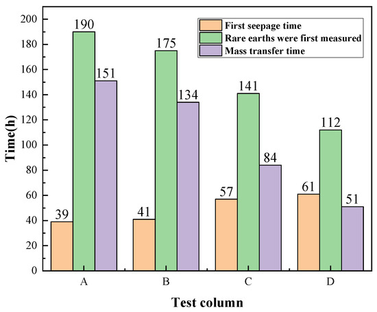 A good indicator is the transfer time of the solute mass, which specifies the difference between the moment when REEs are initially measured and the instant when the liquid seeps out for the first time in the A, B, C and D test columns. The results are shown in Figure 7. The transfer time of solute mass is shortened when the concentration of MgSO4 is increased. In comparison with that of column A, the first seepage time of column D increases by 56.41% due to its higher solution viscosity and slower seepage velocity (mechanical escape velocity). A rising concentration pressure difference of the MgSO4 solution in the ore body raises the diffusion speed of molecules in the solution, which shortens the overall mass transfer time of column D in the ore body by 196.08%, in comparison with that of column A.