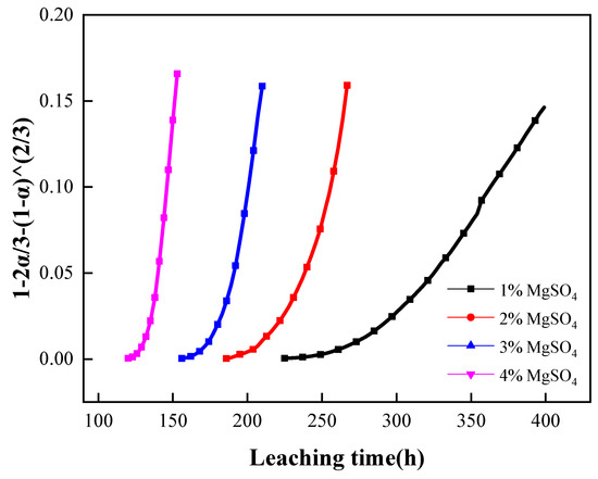 Upon processing the experimental data with the kinetic equation controlled by chemical reaction, we established the relationship between and leaching time (t), as shown in Figure 10. The results of the four tests failed to reach a good linear relationship. Therefore, the kinetic processes leached with the four concentrations of MgSO4 were not subject to the control of chemical reaction.
