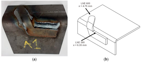 In this work, the LNE 600 steel (base metal), commercially known as NBR6656, which belongs to High-Strength Low-Alloy steel (HSLA), was selected as the study material. The LNE 600 steel is considered a high-strength, low-alloy steel due to the low levels of alloying elements present in the material, along with its manufacturing process through controlled rolling with grain refinement, which allows the best properties of this material to be extracted, as represented in Figure 1a. In addition, the choice of LNE 600 steel was based on studying mainly in the HAZ. In Figure 1b, only LNE 380 steel is referred to as a structural reinforcement used in the agricultural implement. The chemical composition of the base material is presented in Table 1.