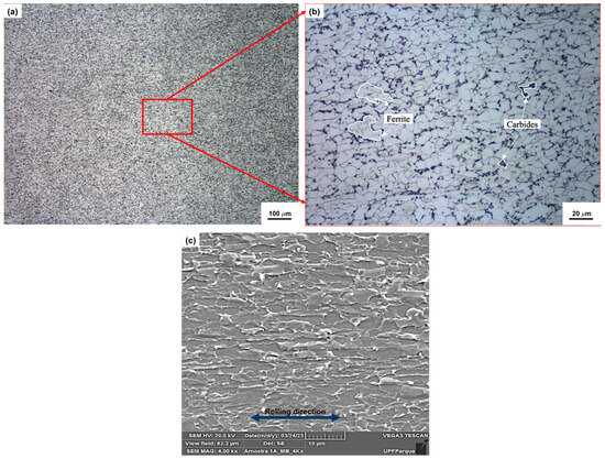 Figure 2 shows the microstructure at different magnifications of LNE 600 steel, from which it is possible to observe a Ferritic–Pearlitic structure with carbide aggregates aligned along the rolling direction.