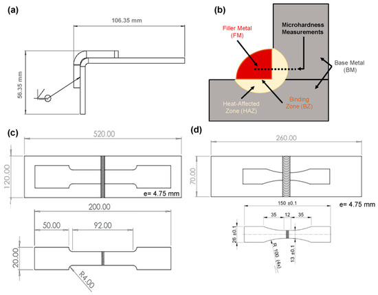 Schemes of mechanical characterizations for the LNE 600 steel. (a) Disposition of the test bodies, (b) measurement of microhardness of the analyzed regions, (c) dimensions of the specimens for the tensile test, and (d) dimensions of the specimens for the fatigue test.
