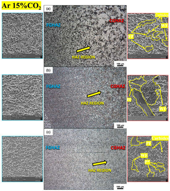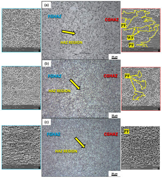 Microstructure of the samples using Ar gas + 15% CO2 for the heat-affected zone (HAZ) region; transformation from coarse grain to refined grain. (a) ER70S-6; (b) ER110S-G; (c) ER120S-G. PF—Primary Ferrite; WF—Widmanstatten Ferrite.