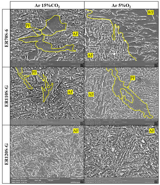Figure 7 presents the microstructure of the main constituents found in the welding wire using shielding gas, Ar + 15% CO2 and Ar + O2, in the filler metal region using SEM. It is observed that the first column of Figure 7, using the shielding gas Ar + 15% CO2, the filler metal region, using the ER70S-6 electrode, presented a less refined structure containing primary ferrite (PF) and regions with acicular ferrite (AF). The ER110S-G electrode showed the formation of PF and regions with AF. For the ER120S-G electrode, there was a more significant presence of AF compared to the others and little formation of PF, generating more excellent resistance in the region. In the case of the second column of Figure 7, which represents the use of the protective gas Ar + 5% O2, PF, AF, and WF formations are identified for the ER70S-6 electrode. The ER110S-G electrode had a higher incident formation of PF and AF, highlighting that, in the ER120S-G electrode, it presents regions of mainly (AF) and parts with (WF).