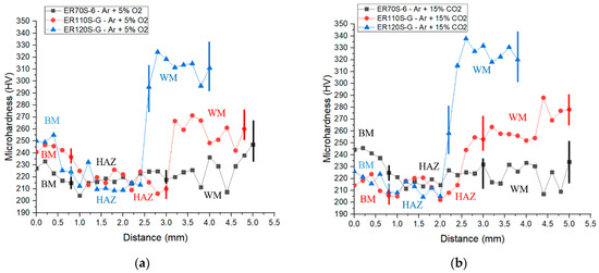 The microhardness profiles for different welding conditions are presented in Figure 8a,b for different shielding gases. Additionally, Table 5 shows the average microhardness and standard deviation for each sample. For both Ar + 5%O2 and Ar + 15%CO2 gases, no significant differences were observed in the hardness results considering the standard deviations when the samples in each analysis region were globally compared. The graphs show the variation in the microhardness values starting from the base material and passing through the HAZ and weld metal regions, as indicated on the graphs. On the other hand, higher hardnesses occur in the weld metal areas for welding conditions with ER110S-G and ER120S-G electrodes. This is mainly due to the difference in microstructure evolution discussed in the previous section.