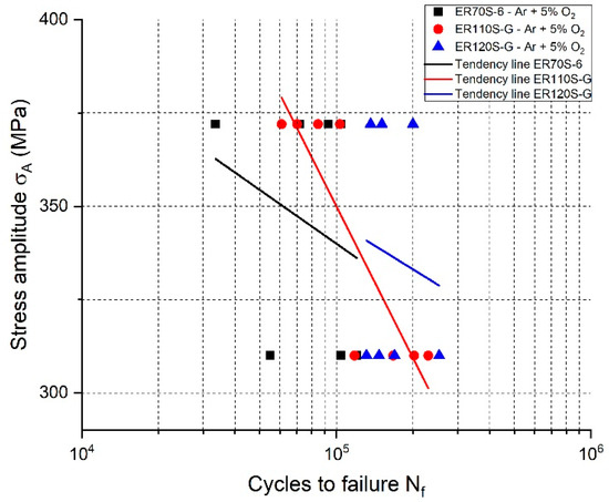 Figure 9 presents the results of the fatigue tests conducted using the Ar + 5% O2 gas and the electrodes. By evaluating the results, it is possible to observe a superior fatigue performance for the ER120S-G electrode under both load conditions employed in the tests. Following that, we can observe a moderate behavior for the ER110S-G electrode and an inferior performance for the ER70S-6 electrode across all fatigue load conditions. This behavior indicates the beneficial effect of the alloying elements present in the ER110S-G and ER120S-G electrodes, an effect that is also reported in other studies [1,2,3,6].