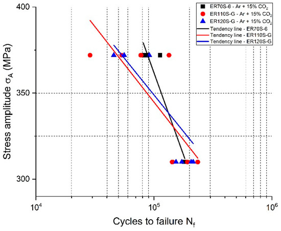 The trend lines presented in the graphs in Figure 9 indicate the superior fatigue behavior of the ER 120S-G electrode at both low and high loads, with the ER 110S-G electrode showing a similar performance at low loads. From this analysis, it is possible to verify the greater resistance to crack propagation generated by the ER 120S-G electrode with the use of O2 gas, these benefits being combined with the reduction in the heat input generated by the shielding gas and the presence of alloy elements in the electrode, with the microstructure generated in this condition being the one with better quality and less modification compared to other conditions. The ER 70S-6 electrode presented a lower performance, as shown in the trend line in the graph; this fact is due to the worse microstructural conditions together with the higher incidence of defects for this welding condition.