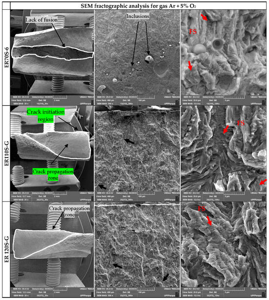 For the fractographic analysis of the samples welded with different filler electrodes and 5% O2 gas, images of the fracture surface are shown using a SEM. The images are presented in Figure 11, with magnifications of 20×, 500×, and 20k× applied to identify cracks fatigue initiation, propagation regions and fatigue streaks (FS red arrows) were discovered. Defects such as a lack of fusion and inclusions, indicated by arrows in the images, can be observed, with cycle marks also shown for the 20k× magnification. Through the analysis of fracture surfaces, it becomes evident that defects like a lack of fusion, inclusions, and weld toe effects are the main points of failure initiation. The fracture behavior was ductile, suggesting that the material did not exhibit areas of high hardness leading to embrittlement, and fatigue fracture was accelerated by the presence of defects and areas of reduced hardness microstructure in the Heat-Affected Zone (HAZ) of the welded materials, allowing the progression of cracks.