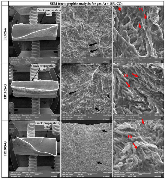 SEM fractographic analysis for the samples using Ar + 15% CO2 gas.