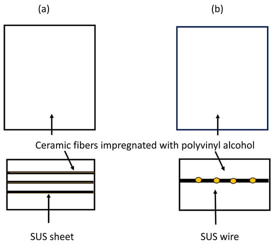 (a) Schematic drawing of ceramic fiber core sheets reinforced by SUS plates with thickness of 0.1 mm. (b) Schematic drawing of ceramic fiber core reinforced by SUS wires with diameter of 0.8 mm.