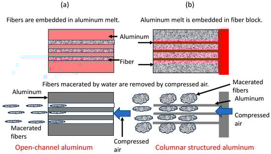Schematic drawing of ceramic fiber template method. Fiber chips soddened with water are removed by compressed air. (a) Fabrication of open-channel aluminum and (b) fabrication of columnar-structured aluminum.