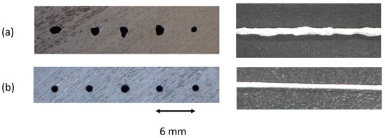 Alternatively, Gillen and Moore adopted electron beam processing to make small holes [17]. In their method, an electron beam produced melting pools. The melt evaporated so that holes were formed. This technique should be conducted in a high-vacuum atmosphere, and thus, the technique is inefficient for practical application. The principle of laser beam processing is similar to that of electron beam processing. Gregory et al. used a focused laser beam in air to melt small points [18]. The technique is laborious and expensive. Furthermore, since aluminum is a lower-melting metal, the holes have an inverse tapered shape, as they widen due to increased melting during laser irradiation. These two conventional techniques can only create holes that are short, having aspect ratios at most as large as 10.