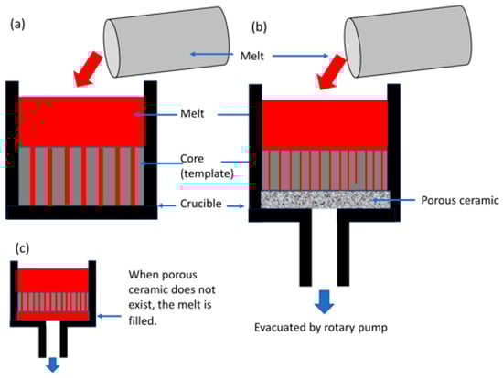 Schematic drawing of melting in crucibles. (a) Atmospheric casting to fabricate channel holes larger than 2 mm in diameter. (b) Vacuum suction casting by inserting porous ceramic to fabricate channel holes less than 2 mm in diameter. (c) Vacuum suction casting without inserting porous ceramic to fabricate channel holes less than 2 mm in diameter.