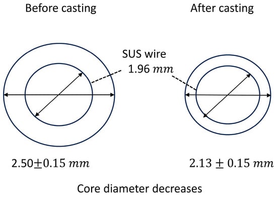 On the other hand, in the wire-extraction method, two methods are shown here. Schematic drawings of the cross-sections of the cores are illustrated in Figure 17. First, boron nitride with a thickness of 0.05 mm was coated on the SUS wires with a diameter of 1.08 mm. After casting, the boron nitride layer did not change. Secondly, a mixture of boron nitride and magnesium hydride with a thickness of 0.05 mm was coated on SUS wire with a diameter of 1.08 mm. After casting, the layer swelled to a diameter of 1.45 mm, and the core volume increased by 1.5. Thus, the change in the core volume in both methods is clearly different before and after casting; the coated layers decrease in volume in the fiber template method, while they increase in volume in the wire-extraction method.