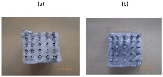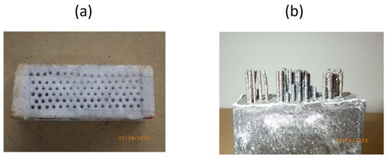 (a) Ninety-seven holes perforated by a micro-drill in a ceramic fiber block. Height of block: 15 mm; holes: 1.2 mm in diameter. (b) Only half of the columns were fabricated by casting, and others were not.
