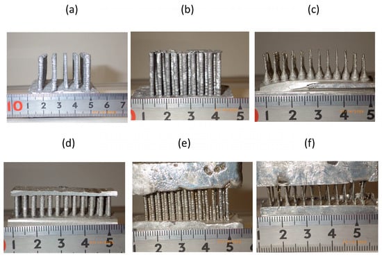 Various sizes of columnar-structured aluminum alloys were fabricated. The columns shown in Figure 10a–c are cantilever-type columns, which were fabricated by a template setup, as illustrated in Figure 6b. On the other hand, columns attached by aluminum alloy plates at the top and bottom were also fabricated, as shown in Figure 10d–f; these were produced by a template setup, as shown in Figure 6c. According to the application, either type of columnar structure should be selected. For example, if this columnar structure is utilized as a microchannel heat sink, one side faces the coolant and the other side faces the heating area, such as joule-heated electronic devices. In this case, a columnar structure attached by aluminum alloy plates at the top and bottom is desirable.