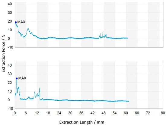 On the other hand, in the fabrication of the open-channel aluminum alloy, it is necessary to extract the reinforced materials, such as plates or wires, that were coated with the adhesive and the mixture of disassembled ceramic fiber and polyvinyl alcohol. The feasibility of extracting the templates is expressed in terms of the extraction force, which is equivalent to the tensile force in the stress–strain curve in the tensile test. This extraction force does not accompany plastic deformation, which is, in other words, the tensile force in the range of elastic deformation. Figure 12 shows an example of the tensile test to pull the reinforced wire of 0.97 mm in diameter and 75 mm in length from the aluminum alloy. These wires were coated with the mixture of disassembled fibers impregnated with polyvinyl alcohol. Figure 13 shows plots of the extraction force versus extraction length of the reinforced wire whose surface was coated with the adhesive and the mixture of ceramic fiber and polyvinyl alcohol. In the extraction process, the wire was pulled out by sliding along the hole without severe friction so that the extraction force almost kept constant. The extraction forces are very small, evaluated as 0 to 5 N. It is known that a wire with an extraction force of less than about 50N can be extracted manually. Thus, the reinforced wire can be pulled out by hand. This is advantageous; the tensile machine is not necessary, and the procedure for the removal of the template materials becomes simple and time-saving with low cost performance.