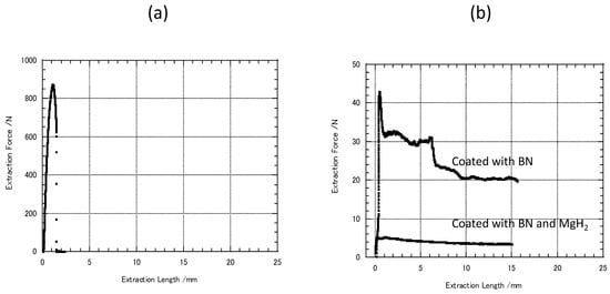 (a) Extraction force–extraction length curve of SUS wire of 1.0 mm embedded in aluminum, (b) extraction force–extraction length curve of SUS wire coated with BN, and extraction force–extraction length curve of SUS wire coated with a mixture of BN and MgH2 [31].