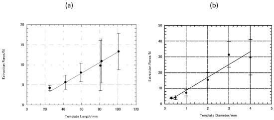 Furthermore, Figure 15a,b shows the dependence of the extraction force of SUS template wires on the template length and the diameter, respectively. The SUS wires were coated with the mixture of BN and MgH2 with a weight ratio of WMgH2/WBN = 1.5. The extraction force of wires was decreased owing to the addition of MgH2. In the measurement of the result described in Figure 15a, the template diameter was kept constant at 1.0 mm, while in the measurement of Figure 15b, the template length was kept constant at 40 mm. The extraction force is directly proportional to the length of the wires, and the extraction force increases linearly with an increase in the diameter of the wires. Taking these results into consideration, the increase in the contact area of the wires to the aluminum alloy increases the extraction force because of the increase in the friction force between them.