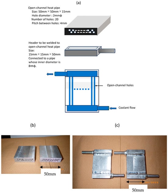 (a) Schematic drawing of open-channel heat sink and header, (b) open-channel aluminum alloy AC4CH for heat sinks, and (c) open-channel heat sinks welded with headers.