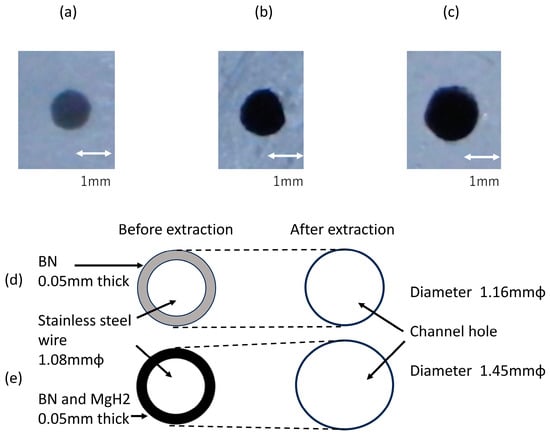 (a) Cross-sectional view of SUS wire embedded in aluminum. (b) Cross-sectional view of a channel hole perforated by the extraction of SUS wire coated with BN. (c) Cross-sectional view of a channel hole perforated by the extraction of SUS wire coated with BN and MgH2. (d) Schematic drawing of a section of a channel hole extracted by SUS wire coated with BN, and (e) schematic drawing of a section of a channel hole extracted by SUS wire coated with BN and MgH2 [31].