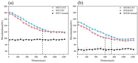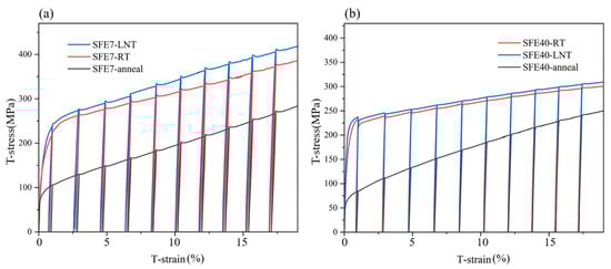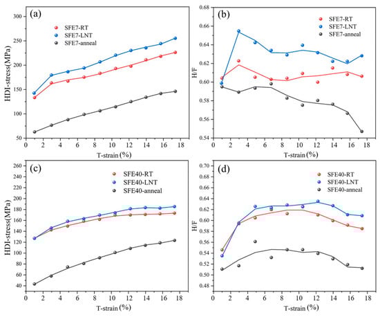 - The HDI stress of the gradient-structured SFE-7 sample is higher than that of the gradient-structured SFE-40 sample, especially at cryogenic temperatures. The HDI/flow stress ratio of the gradient-structured SFE-7 sample has a high value above 0.6.