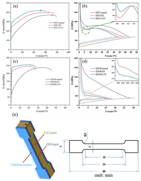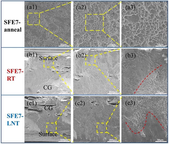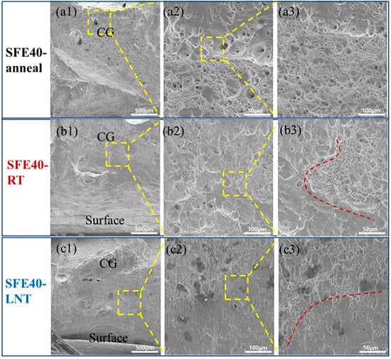 - Due to the generation of the GS layer, the fracture features of the SMATed SFE-7 and SFE-40 samples show brittle and ductile fracture. The annealed homogenized CG samples without SMAT are characterized by ductile fracture.
