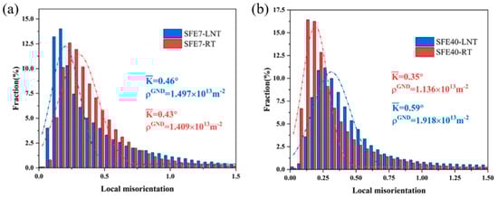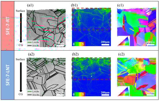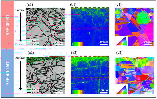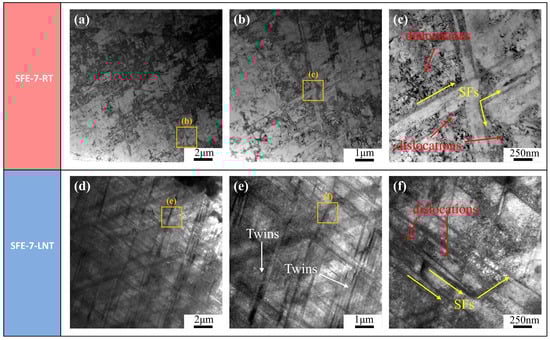 - The EBSD results indicate that for both the SFE-7 and SFE-40 alloys, the kernel average misorientation of grains of samples SMATed at cryogenic temperatures is higher than that at room temperature. The TEM results reveal that SFE-7-LNT has more deformation twins and dislocations compared to SFE-7-RT.