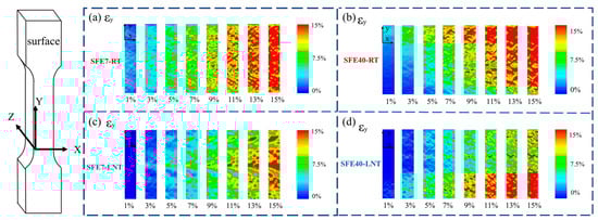 - The DIC results show that the stress dispersion of SFE-7 is performed more uniformly than that of SFE-40. Significant strain bands appear after 9% strain in the tensile tests of SFE-40 samples, but SFE-7 samples maintain a more uniform strain development with increasing strain.