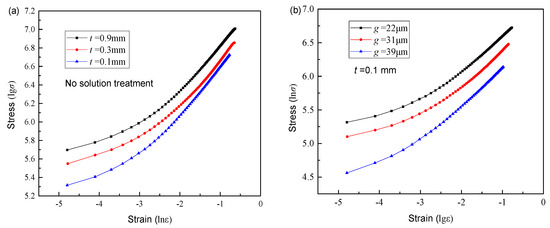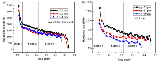 - The hardening rate curve of 316L stainless steel sheets can be divided into three stages: rapidly decreasing, slowly decreasing, and stabilizing. For the samples with the same grain size, the thicker specimen has a higher hardening rate. For the same sample thickness, the hardening rate decreases with an increase in grain size.