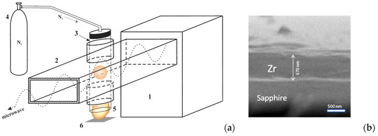 Scheme of the experimental setup with MW plasmatron (a): 1—MW unit with a 2.45 GHz magnetron, 2—rectangular waveguide, 3—quartz tube, 4—N2 gas cylinder, 5—plasma flame, 6—sample. SEM images of Zr/sapphire films (b).