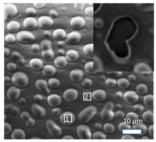SEM images of the zirconium film on sapphire after treatment in microwave plasma. Symbols: 1—microbubble area; 2—film between microbubbles. Inset: image of an open microbubble.