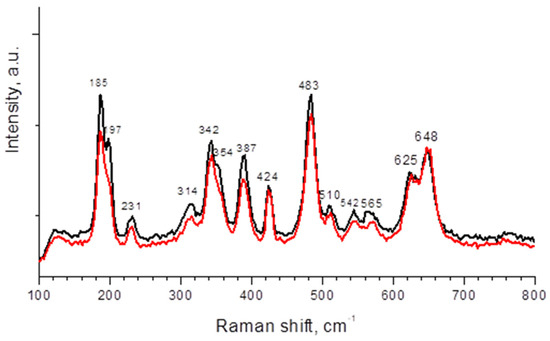 Raman spectra of Zr film after treatment in microwave plasma (m-ZrO2): black curve—microbubble area; red curve—film between microbubbles.