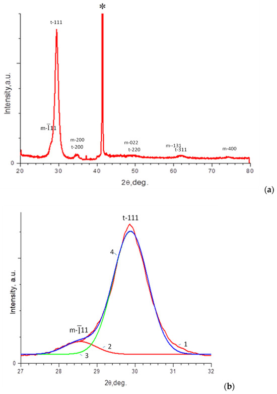 According to the XRD data during plasma treatment (Figure 4), a weakly textured film of [111]-ZrON with a structure of t-ZrO2 (JCPDS # 00-017-0923) is formed. Diffraction peaks were detected at 2θ of 30.2, 35.24, 50.28, 59.4, and 74.1, which can be indexed to the corresponding crystal facets of (111), (200), (220), and (400) of the tetragonal phase of ZrO2. In addition to the main phase, inclusions of m-ZrO2 (JCPDS # 00-037-1484) oriented by the planes (−111), (200), (−112), (211), and (400) are observed. The deconvoluted pattern showed (Figure 4b) two peaks corresponding to a minor and major peak of the (−111) plane of monoclinic and (111) plane of tetragonal ZrO2, respectively.