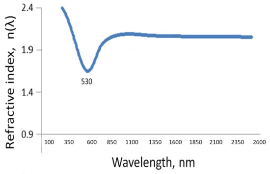 For the ZrON film, the spectral dependence of the refractive index was measured. Overall, a normal dispersion of the refractive index is observed, typical for the dielectric ZrO2 [28]. As can be seen from the data in Figure 5, with an increase in light wavelength, the value of the refractive index monotonically decreases, and the dispersion dependence n(λ) appears normal. However, a feature related to plasmonic absorption in the ZrN inclusions is observed in the area of 530 nm, associated with a high density of free electrons within them. Similarly, a strong plasmonic resonance in the area of 500–600 nm was discovered when evaluating the energy loss function in (TiZr)N composition films [29]. The density of free electrons in metal nitrides reaches 1021 cm−3 [29]. To prevent the spreading and concentration of analyte molecules when studying Raman scattering spectra, the hydrophobicity of the substrate is important. The hydrophobic properties of ZrON films on sapphire were investigated using aqueous MB solutions with concentrations of 1, 5, and 10 mM.