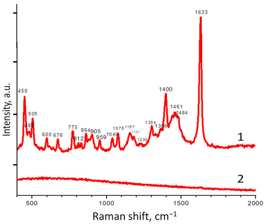 It can be observed that the spectral dependence of the Raman scattering intensity peaks of MB on the ZrON substrate corresponds to what was obtained earlier in [34]. There are differences present: high resolution, manifestation of the fine structure of individual intensity peaks. It should be noted (Figure 7) that for some peaks, a shift, enhancement, and separation into components were observed, indicating an SERS effect.