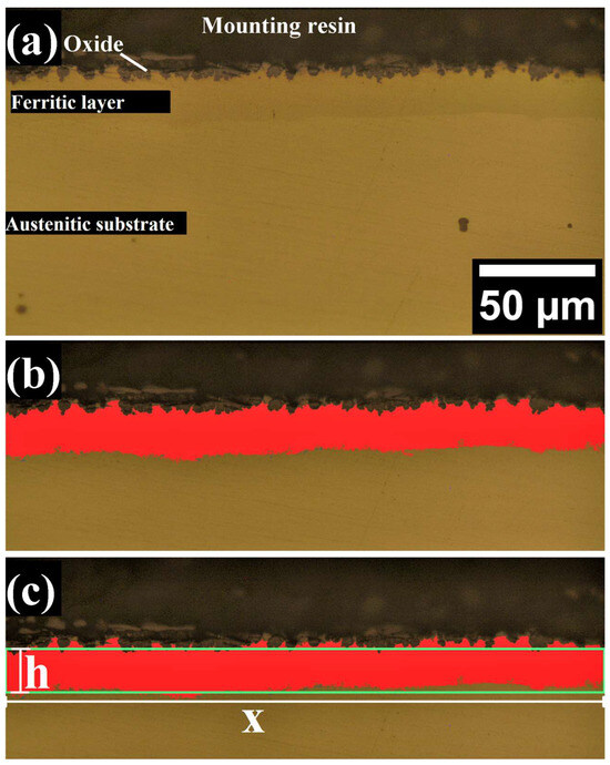 Ferrite layer selection and average thickness measurement through digital image analysis of an optical microscope image. In (a), the relevant regions are labeled, in (b), the selected ferritic area is marked in red and in (c) the width (x) and calculated average height (h) are shown in the green rectangle.