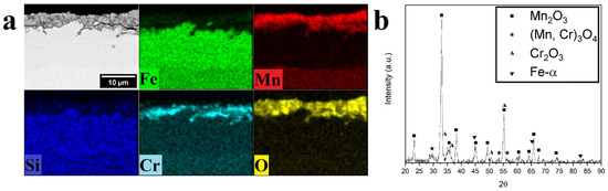 The pre-treatment formed a Mn-depleted ferritic layer with an average thickness of 9 μm and an average Mn and Cr content of 0.8 and 5.8 wt.%, respectively (measurements done via EDS). As expected, the samples also suffered oxidation, gaining, on average, 0.00263 ± 0.00108 kg/m2 during the pre-treatment. Due to the slow furnace cooling rate at the end of the test and the short exposure time, which formed only a thin oxide layer, it was possible to avoid any observable spallation (no spalled oxide was detected in the crucibles or during the handling of the samples). Furthermore, a similar FeMnSiCrNi alloy was shown to be resistant to spallation under cyclic conditions for almost 300 h of exposure at 1000 °C [29]. Both Mn and Cr contents were lower than in the unoxidized alloy, which is expected, as both Mn and Cr are consumed during oxidation. For this reason, the Cr-to-Mn ratio after pre-treatment is not as favorable for chromia formation as that previously reported and achieved via vacuum annealing [21], in which only Mn was volatilized. The EDS analysis of a pre-treated sample in Figure 2a shows the Mn-depleted region and the Mn-rich oxide layer. An oxide layer rich in Mn and Cr is present below the pure Mn oxide layer, probably consisting of the Mn–Cr–O spinels observed in similar alloys [22,23,29]. No Fe was detected in the oxide layer. The pattern obtained via XRD analysis, shown in Figure 2b, has strong Mn2O3 crystalline peaks and weaker Fe-α (substrate), (Mn, Cr)3O4 and Cr2O3 peaks. Interestingly, the stable Mn oxide species at this temperature is assumed to be Mn3O4, both according to the phase diagram and previous tests at this temperature on a similar alloy [28,29]. This shows that part of the layer seen here was probably formed during heating and could suffer transformation if the treatment ran for longer. Furthermore, the formation of Mn2O3 during a short period (30 to 90 min) of exposure to 1000 °C was previously observed in a similar alloy [19]. In general, it appears that the pre-treatment was successful in generating the (Mn, Cr)3O4 spinels and Cr2O3 oxides (the second being in very small quantities, as indicated by the low diffraction intensity), which have protective capabilities [21,22,23]. However, even with the presence of these oxides, the layer formed during the pre-treatment is not highly protective by itself, as the EDS maps do not show the presence of any continuous pure Cr oxide layer. The Mn–Cr–O spinels are more resistant to further oxidation than pure Mn oxides, but it is still not as protective as chromia [30]. A continuous chromia layer would be hard to create even with different oxidation parameters. As the Mn-Cr-O phase diagram shows, Cr2O3 is only stable at a Cr-to-Mn ratio higher than 3:2, which is not the case for the alloy in its initial state [28].