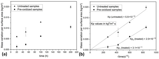 Mass variation analysis (mass variation data in Figure 3a and square root transform in Figure 3b) shows that the pre-treated samples gained less mass throughout the entire test. However, it is important to highlight that the samples gained more mass during pre-oxidation (0.00263 ± 0.00108 kg/m2) than during the first 20 h of exposure (0.00137 ± 0.00069 kg/m2). This is attenuated throughout the test, as the mass gained through exposure constantly increases, eventually becoming much greater than that gained during pre-treatment. Furthermore, even if the average mass gained during the pre-treatment is added to the mass gained after 20 h of exposure (totaling 0.004 kg/m2), the value would still be smaller than the mass gain of the untreated sample (0.00683 kg/m2).